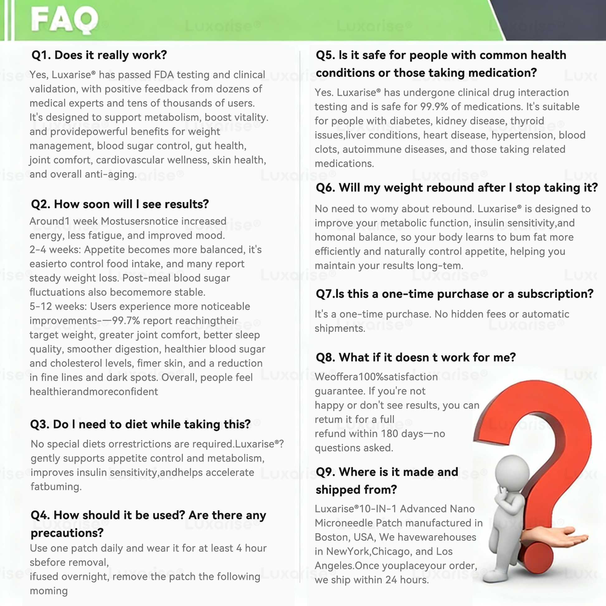 𝑳𝒖𝒙𝒂𝒓𝒊𝒔𝒆® 𝑴𝒐𝒓𝒊𝒏𝒈𝒂 & 𝑩𝒆𝒓𝒃𝒆𝒓𝒊𝒏𝒆 10-𝑰𝑵-1 𝑨𝒅𝒗𝒂𝒏𝒄𝒆𝒅 𝑵𝒂𝒏𝒐 𝑴𝒊𝒄𝒓𝒐𝒏𝒆𝒆𝒅𝒍𝒆 𝑷𝒂𝒕𝒄𝒉 razvili su uz više od 20 godina istraživanja multidisciplinarnog tima s preko 30 stručnjaka. Svaki flaster uključuje ultra-finu mikroiglenu arhitekturu, debelu otprilike jednu sedminu ljudske dlake, dizajniranu za glatku i gotovo bezbolnu aplikaciju. Formulacija sadrži visoko koncentrirane prirodne bioaktivne spojeve, do 20 puta više od uobičajenih razina na tržištu, uključujući Moringu i Berberin, koji djeluju sinergijski za podršku zdravoj glikemijskoj odgovornosti, regulaciji apetita i metabolizmu lipida, potičući postupno i održivo upravljanje tjelesnom težinom. Obogaćen s NAD+, flaster dodatno podržava čvrstoću kože i strukturnu otpornost tijekom fluktuacije tjelesne težine, pomažući održati vitak izgled bez ugrožavanja udobnosti ili estetike. Dodatne visoko učinkovite komponente pridonose podršci imunološkoj funkciji, probavnom zdravlju, ravnoteži crijeva, zdravlju žena, dnevnoj razini energije i smanjenju umora, što sve zajedno potiče mlađe i otpornije fiziološko stanje iznutra. Proizveden u objektima certificiranim prema GMP standardu, koji zadovoljavaju i australske i EU standarde kvalitete, ovo beziglena, znanstveno potkrijepljeno rješenje osigurava siguran i cjelovit pristup učinkovitom upravljanju tjelesnom težinom i dugoročnom metaboličkom zdravlju, dizajnirano da djeluje u harmoniji s tijelom, a ne protiv njega.